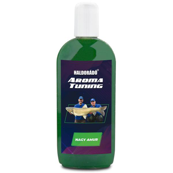 Haldorádó Aroma Tuning Nagy Amur sötétzöld színű, sűrű, tömény kevert aroma. Az etetőanyag tesztek során vált világossá, hogy az amur mennyire jól reagál a nyári meleg vizekben a különböző zöldfűszerek keverékéből alkotott aromákra. Akik nem kedvelik ezeket a fűszereket, azok elé egy erős, tömény illat tárul a flakon kibontásakor, de nem szabad elfelejteni, hogy ez nem nekünk készül, valamint, hogy a célhalunk az AMUR, aki pedig pont ezekre bukik. Ebbe az aromába áztatott magvakkal vagy ezzel bekevert etetőanyagokkal, garantáltan az etetésünkre tudjuk csalni a torpedótestű növényevőket. Ennek az aromának is a gyümölcscukor szirup a hordozó anyaga, így egy fűszeres, ugyanakkor édes ízű terméket vehetünk kézbe. Az aroma a Haldorádó etetőanyag családból a Nagy Amur, a Red Tuning pelletek közül szintén a Nagy Amur, valamint az azonos nevű üveges kukoricával megegyező ízvilágú.