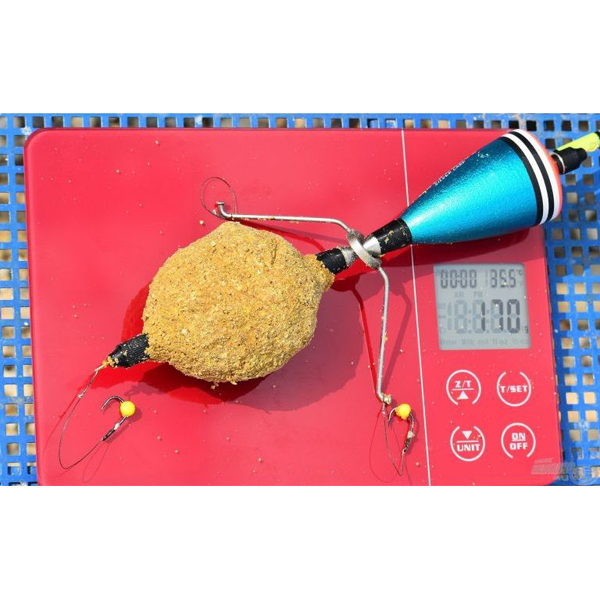 - Az úszó önsúlya (horgokkal együtt) 47 gramm, és a kosárba akár 135 gramm súlyú nedves, jól felhőző etetőanyag is tölthető. Ezek együttes tömege 182 gramm is lehet! Fontos, hogy ehhez megfelelő erősségű horgászbotot és kellően vastag zsinórt vagy fonott dobóelőkét válasszunk!