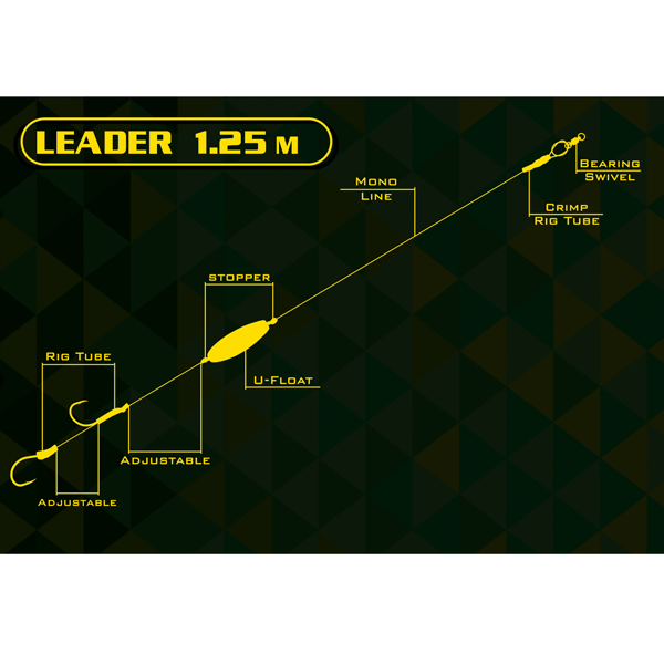Ez az előke az egyik leguniverzálisabb felkínálási módot teszi lehetővé. Használhatjuk élőhalas vagy akár puha testű csalik felkínálásához. A szereléken található U-Float lebegő úszónak köszönhetően a csalink a mederfenék felett fog lebegni, nem hagyja azt az iszapba belesüllyedni. Az extra csalogatóhatás érdekében az EVA anyagot akár aromásíthatjuk is. A teljes előke hossza 125 cm.