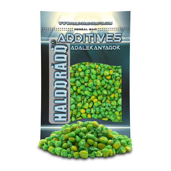 Haldorádó Főtt Kukorica „amur” ízesítésben. A főtt kukorica natúr változatban is az egyik legnépszerűbb csalogatóanyag, ám tovább ízesítve jelentősen megnövelhetjük annak hatását. Az „amur” ízesítésű magvak a sok hazai vízben is megtalálható, nagyra növő növényevő halnak, az amurnak próbál meg a hínár-sás + pisztácia aromájával kedveskedni. Ez messziről a horgászhely közelébe csalogatja a kíváncsi torpedókat. Önmagában, egyre nagyobb mennyiségen szórva igazán hatásos, de ez több napot igények. Ha már a rövid idejű horgászatok során is szeretnénk vendégül látni a halakat, akkor a bevált amuros etetőanyagunkba érdemes keverni, adagolása ilyenkor felkúszhat akár 30-40 %-ig is.
