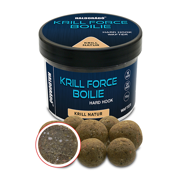 A Krill Force egy teljesen új termékcsalád, melyhez fogható nincs a Haldorádó palettán. Minden e családban lévő termék alapja a legmagasabb minőségű krill és hallisztek mesteri keveréke. Ilyen magas beltartalmi értékekkel rendelkező, ennyire összetett, de ugyanakkor naturális jellegű csali, még nem volt a palettánkon. A termékcsalád három tagot számlál, melyek ízesítésben minimálisan eltérnek egymástól. A Krill Natur teljesen natúr, ízesítetlen változat. A Hot Spicy csípős fűszerkeverékkel ízesített, míg az Indian Spice egy különleges indiai, enyhén csípős fűszerkeverékkel készül. Tapasztalataink azt mutatják, hogy legyen akármilyen jó is egy bojli, a halak legszívesebben a könnyített falatokat részesítik előnyben, így ebből a termékcsaládból sem hiányozhat egy wafter csali. Ezeknek a változatoknak a specialitásuk, hogy rendkívül hajszálelőke állók, ami annyit tesz, hogy minimum 72 órát kibírnak a vízben. Annyira kemények, hogy ilyen hosszú ideig is ellenállnak a fehérhalak, sőt, akár a törpeharcsák támadásának is, így megvárják a később érkező nagytestű halakat is. A Krill Force Boilie Hard Hook Wafter prémium minőségű csalizó bojlik kétféle kiszerelésben érhetők el a kínálatban. A kisebb változatban 16 és 20 mm-es, míg a nagyobb változatban 24 és 30 mm-es golyók találhatók.