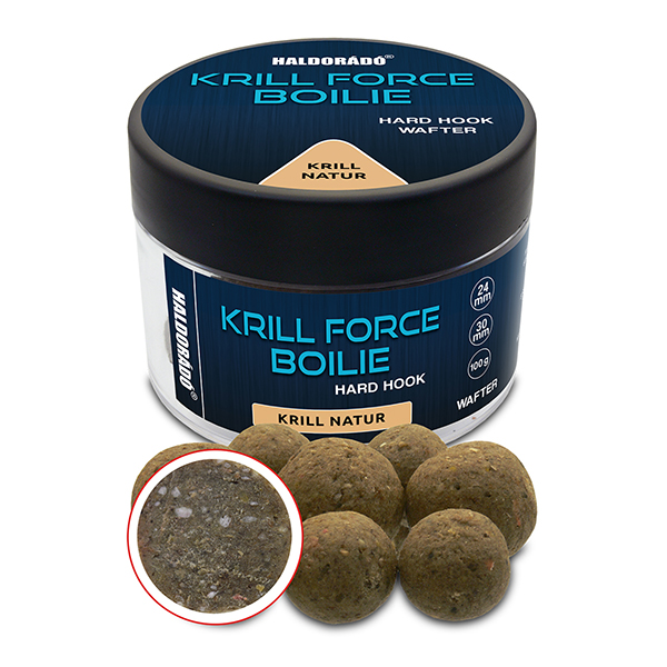 A Krill Force egy teljesen új termékcsalád, melyhez fogható nincs a Haldorádó palettán. Minden e családban lévő termék alapja a legmagasabb minőségű krill és hallisztek mesteri keveréke. Ilyen magas beltartalmi értékekkel rendelkező, ennyire összetett, de ugyanakkor naturális jellegű csali, még nem volt a palettánkon. A termékcsalád három tagot számlál, melyek ízesítésben minimálisan eltérnek egymástól. A Krill Natur teljesen natúr, ízesítetlen változat. A Hot Spicy csípős fűszerkeverékkel ízesített, míg az Indian Spice egy különleges indiai, enyhén csípős fűszerkeverékkel készül. Tapasztalataink azt mutatják, hogy legyen akármilyen jó is egy bojli, a halak legszívesebben a könnyített falatokat részesítik előnyben, így ebből a termékcsaládból sem hiányozhat egy wafter csali. Ezeknek a változatoknak a specialitásuk, hogy rendkívül hajszálelőke állók, ami annyit tesz, hogy minimum 72 órát kibírnak a vízben. Annyira kemények, hogy ilyen hosszú ideig is ellenállnak a fehérhalak, sőt, akár a törpeharcsák támadásának is, így megvárják a később érkező nagytestű halakat is. A Krill Force Boilie Hard Hook Wafter prémium minőségű csalizó bojlik kétféle kiszerelésben érhetők el a kínálatban. A kisebb változatban 16 és 20 mm-es, míg a nagyobb változatban 24 és 30 mm-es golyók találhatók.