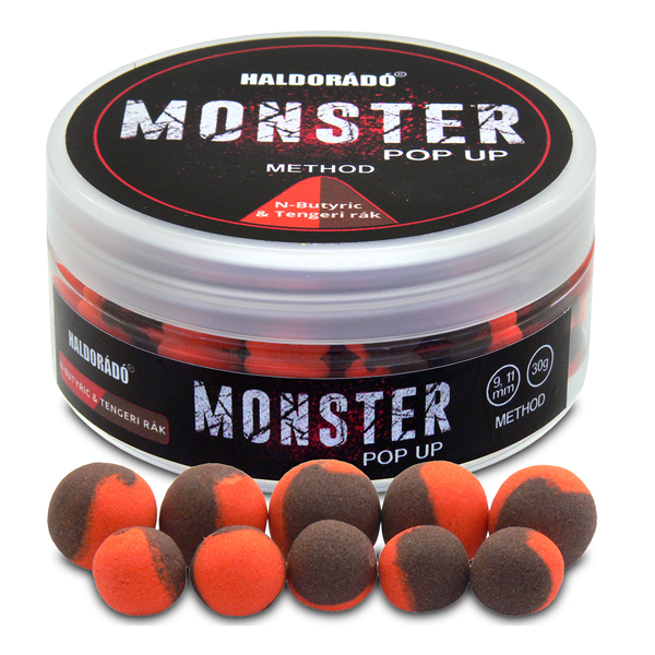 A Haldorádó Monster Pop Up Big Carp termékcsalád tagjai nem a kellemes, emberi orr számára élvezhető illatokról híresek, viszont fogósságuk megkérdőjelezhetetlen! A csalik és etetőpelletek mellett egyértelmű, hogy aroma formában is megtalálható ez a termékcsalád a kínálatunkban. A csalik nagy felhajtóerejű lebegő (Pop Up) csalik, amelyek mindenképpen nagyobb, vastagabb horgot és vastag csalitüskét igényelnek. Ennek oka egyszerű, ezek nem kishalas csalik! A cél egyértelműen a nagyobb halak kiválogatása, amelyek biztonságos megfogásához nagyobb méretű horogra van szükségünk. A nagy felhajtóerejű csali a nagyobb horgot is remekül balanszírozza, így létrehozva a tökéletes nagyhalas csali-felkínálást! A MONSTER Pop Up Big Carp tégelyében 13 és 17 mm-es változatok találhatók meg. A golyóknak nemcsak ízük, de színük is kevert, így feltűnők a sötétebb színű aljzaton, vagy pelletes bojlis etetésen is. Hatféle ízváltozatban kerülnek forgalomba: Vajsav & Tengeri rák (narancssárga+barna), Fűszeres máj (fekete+piros), Máj & Vér (barna+piros), Tintahal & Áfonya (rózsaszín+fekete), Vörös Lazac (sárga+vörös), és Hot Mangó (narancssárga+fehér).