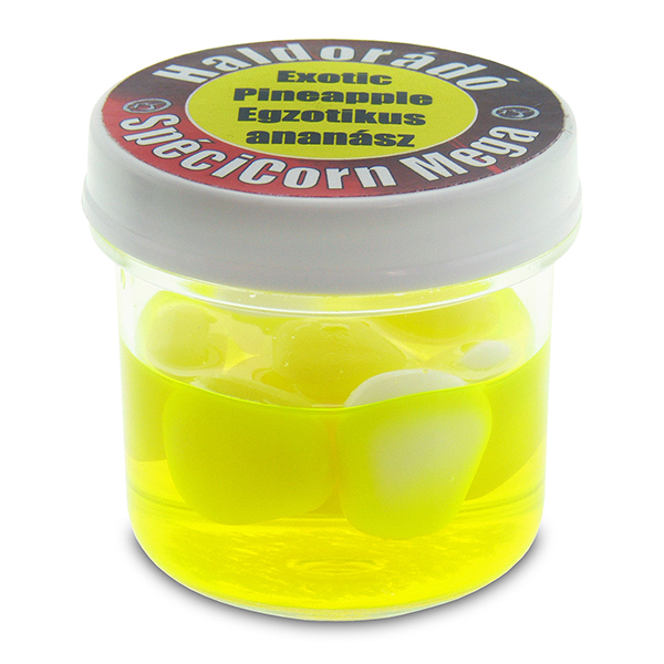 A SpéciCorn Mega nem más, mint nagyméretű ízes, színes, lebegő gumikukorica. Ezek a rugalmas, nagyméretű csalik minden helyzetben megállják a helyüket! Ellenállnak a legmohóbb apróhalaknak is, még a törpeharcsa sem képes leoperálni a hajszálelőkéről. Ellenállóságukkal időt nyerünk, és biztosak lehetünk abban, hogy csábító aromáját előbb, vagy utóbb a közelben úszkáló nagytestű halak is megérzik! A SpéciCorn Mega nevében is jelzi méretét, amely a hagyományos gumikukoricánk háromszorosa. Minden tégelybe minimum két különböző színváltozat került. A sárga színű alap csali nem hiányozhat egyik ízesítésnél sem, amit kiegészítettünk különleges, az adott aromával harmonizáló fluo színű gumikukoricákkal. Hat különleges ízben kerül forgalomba, ezek: Magyar Betyár/Hungarian Outlaw, Egzotikus Ananász/Exotic Pineapple, Nagy Amur/Big Grass Carp, Epres Kókusz/Strawberry&Coconut, Fehér Rum/White Rum, TripleX.