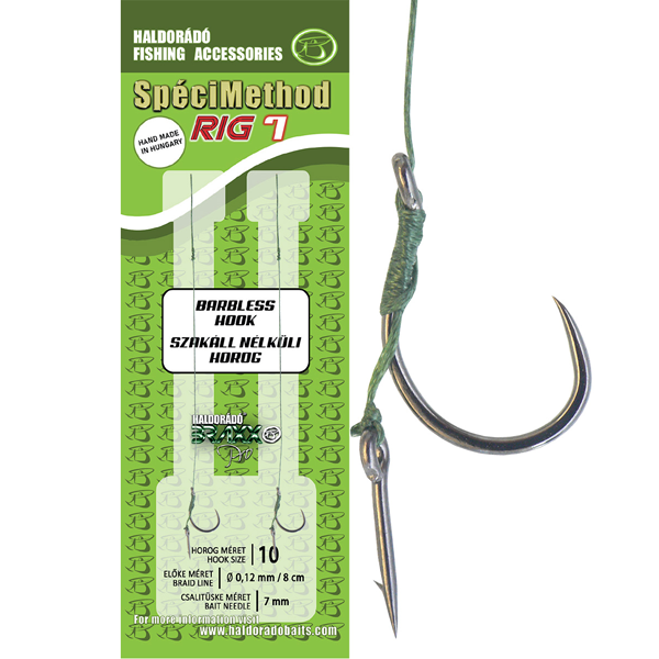 A Haldorádó SpéciMethod Rig nem más, mint egy minőségi alapanyagok felhasználásával készült, profi csalitüskés horogelőke. 8 cm hosszú, 0,12 mm átmérőjű fonott zsinórra kötött, 12-es szakáll nélküli horoggal és 7 mm-es csalitüskével ellátott előke, amely szorgos magyar kezek munkáját dicséri. Pont olyan, amelyet mi is használunk, amelyet jó szívvel ajánlunk!