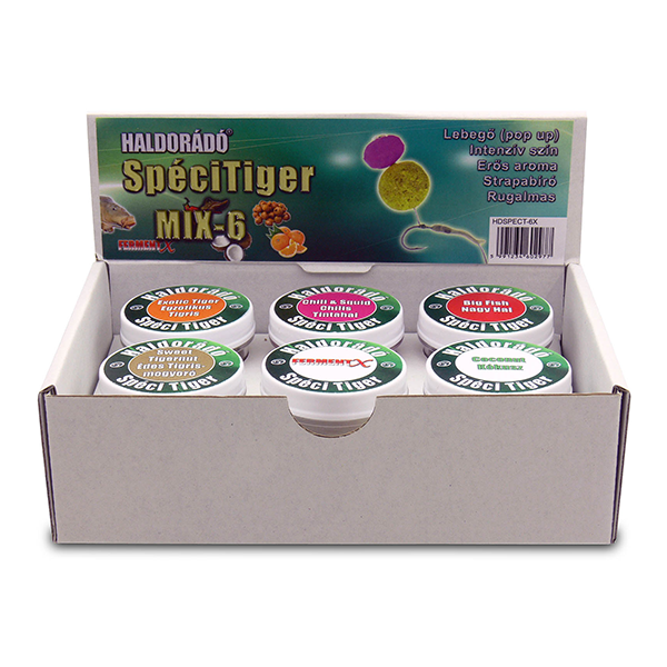 A Haldorádó SpéciTiger , azaz gumi tigrismogyoró imitáció miatt sok levelet kaptunk, hiszen a SpéciCorn megjelenését követően a horgászok is meglátták a „műcsalikban” rejlő lehetőségeket. Az igényeknek megfelelően ezt is hat különböző ízesítésben, a hagyományos SpéciCorn 3,5-szeres felhajtóerejével készítettük el. Ezek a rugalmas, nagyméretű csalik minden helyzetben megállják a helyüket! Ellenállnak a legmohóbb apróhalaknak is, még a törpeharcsa sem képes „leoperálni” a hajszálelőkéről. Ellenállóságukkal időt nyerünk, és biztosak lehetünk abban, hogy csábító aromáját előbb, vagy utóbb a közelben úszkáló nagytestű halak is megérzik! Itt a csali alapszíne barna, ebből található négy szem minden tégelyben, és ezeket egészítettük ki a Mega kukoricához hasonló módon különleges színekkel. Hat ízben kerül forgalomba: Chilis Tintahal/Chili&Squid, Nagy Hal/Big Fish, FermentX/FermentX, Egzotikus Tigris/Exotic Tiger, Kókusz/Coconut, Édes Tigrismogyoró/Sweet Tigernut.