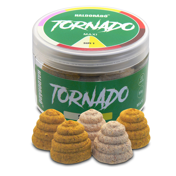 A Haldorado Tornado Maxi megőrizte a Tornado csalik különleges formáját, de az elődökkel ellentétben ez egy süllyedő, oldódó csali. Megnövelt, 22 mm-es mérete miatt, a szelektív nagyponty-horgászok számára lett optimalizálva, de a kapitális halakra pályázó feederezőknek is megoldást jelenthet, ha ki kell válogatni a nagyját. Oldódás közben folyamatosan adagolja magából az íz és illatanyagokat, így gyorsan felkelti a halak figyelmét. Minden TORNADO MAXI tégelye két különböző színű csalit tartalmaz, ezzel is teret engedve a további kísérletezéseknek. Az Édes Szamóca sárga és piros, a Rokfort Sajt, N-Butyric & Ananász, Mangó narancs és sárga, a Mézeskalács citromsárga és barna, a Fokhagyma & Mandula fehér és sárga, a Puncs & Menta rózsaszín és sárga, míg a Tintahal & Barack narancs és rózsaszín színezetet kapott.