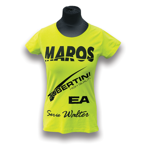 A Maros kerek nyakú női pólónak anyaga single Jersey, 95 % pamut, 5 % elasztán.