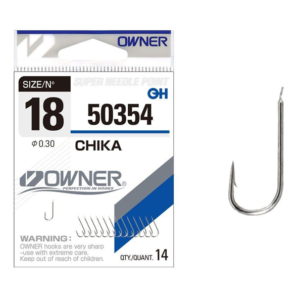 Owner 50354 Chika egy nikkel színű, könnyű, hosszú szárú és kerek öblű horog, mely elsősorban keszeg horgászatára teszi alkalmassá. Erőssége és hosszú szára miatt nagyobb méretekben alkalmas törpeharcsa vagy nagytestű dévérkeszeg versenyszerű horgászatára is. Mikroszakálla és hegykialakítása miatt kisebb méretekben nem okoz vele gondot a szúnyoglárva csalizása sem.