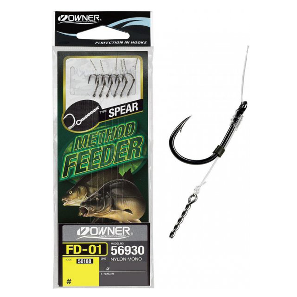 Owner Method Feeder Előkötött horgok. Csalitüskével ellátott, monofil zsinórra kötött tűhegyes Owner horgok, szakállas kivitelben.