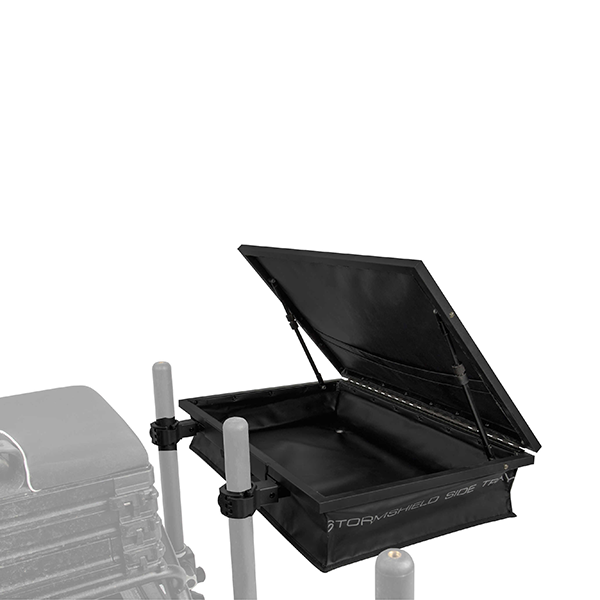 Az OffBox 36 Storm Shield oldalsó tálcában biztonságban tudhatjuk csalijainkat, függetlenül attól, hogy milyen időjárási viszonyok vannak a nap folyamán. A nagy EVA tálca sok csali számára alkalmas rakodótér, míg a teleszkópos támasztókarok lehetővé teszik a fedél szögének az időjárási viszonyoktól függően történő beállítását. Amikor a fedél nyitva van, belül további zsebek találhatók, amelyek belsejében olyan eszközöket tárolhatunk, mint az előketartó dobozok, ollók fogók, vagy akár a mobiltelefon. Az EVA anyaga könnyen törölhető vagy öblíthető minden horgászat után. A népszerű Stormshield Side tálca XL-es változata ugyanazokkal a tervezési jellemzőkkel rendelkezik, mint a standard modell, de több helyet biztosít. Ennek a nagyobb tálcának a megtámasztására egy 36 mm-es teleszkópos támasztóláb és tartó van felszerelve.