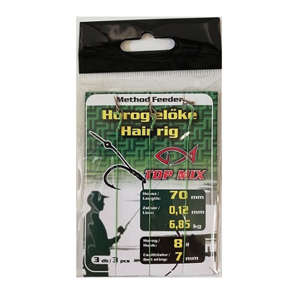 0.12 mm-es fonott zsinórra kötött 8-as horog, hajszálelőkén 7mm-es csalitüskével.